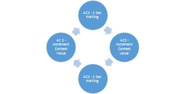 Step#4: Join both the action calls – AC2 (Action call 2 created in step#2) should have AC3 (Action call 3 created in Step#3) and then AC3 should have AC2 as sub action call. In that way, Whenever AC2 triggers, it waits for 1 sec and calls AC3 => Which then simply increments my counter in context and calls AC2 again. The loop will continue till the time my condition (StopTimer==0) fails on AC3. Here is a quick diagram that might help in understanding this cycle.