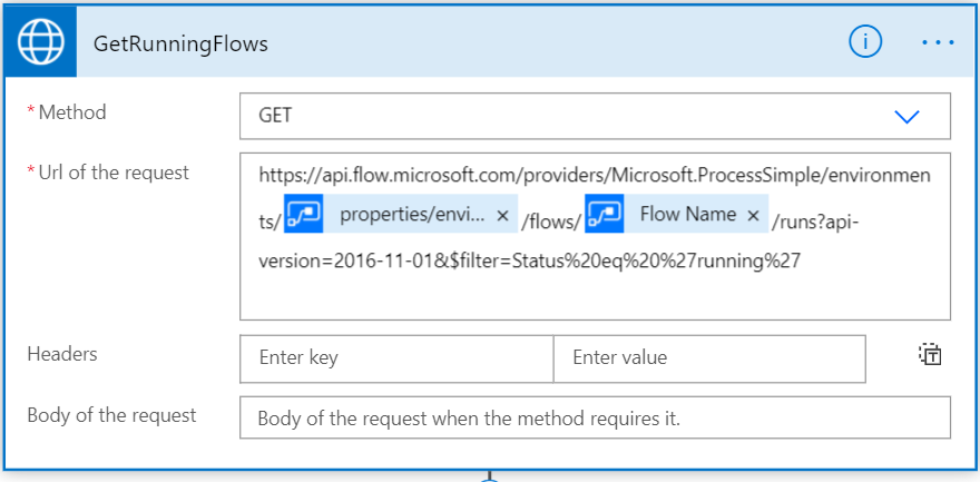 Flow URL : https://api.flow.microsoft.com/providers/Microsoft.ProcessSimple/environments/@{items('LoopthroughAllFlows')?['properties/environment/name']}/flows/@{items('LoopthroughAllFlows')?['name']}/runs?api-version=2016-11-01&$filter=Status%20eq%20%27running%27
