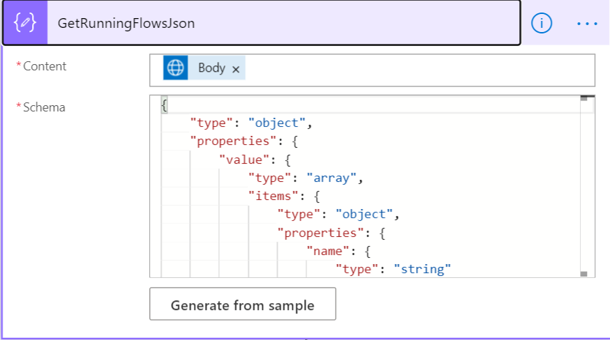 Parse the output of the REST API call to JSON definition using parseJSON action (note the name of the action changed to GetRunningFlowsJson).