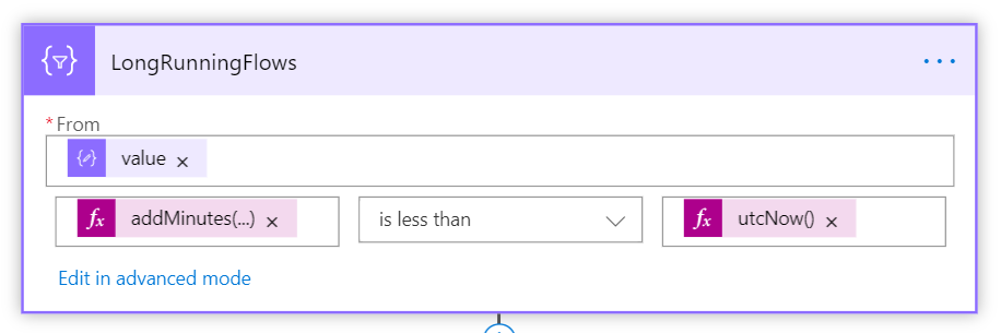 {"inputs": { "from": "@body('GetRunningFlowsJson')?['value']", "where": "@less(addMinutes(item()?['properties']?['startTime'], 15), utcNow())" }} |